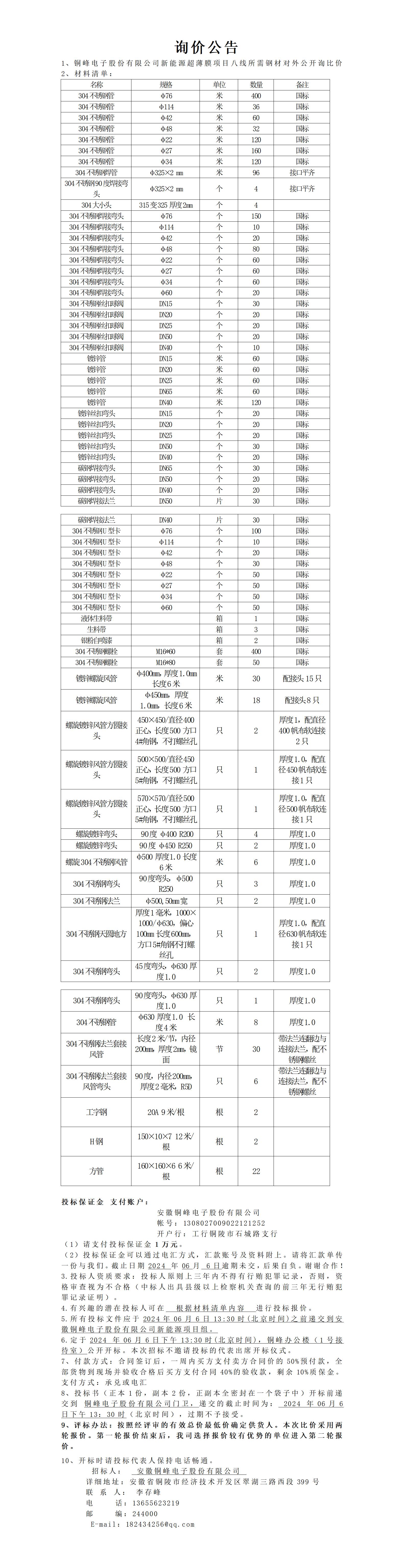 銅峰電子股份有限公司新項(xiàng)目八線縱拉、橫拉、電暈鋼材詢比價(jià)公告
