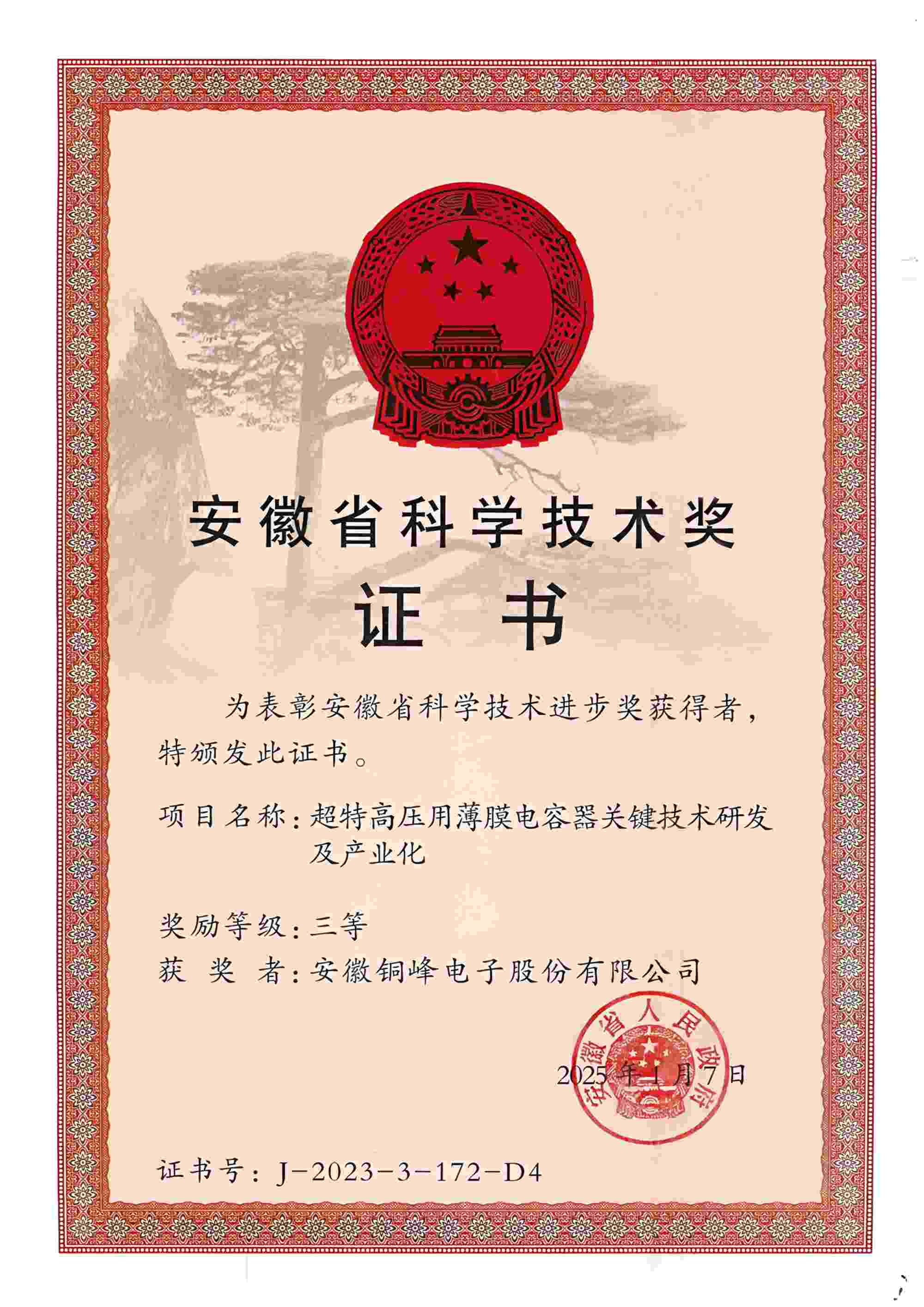 5月12日上午,安徽省科技創(chuàng)新大會(huì)召開,隆重表彰2023年度安徽省科學(xué)技術(shù)獎(jiǎng)勵(lì)獲獎(jiǎng)人員和組織。公司與國(guó)網(wǎng)安徽省電力有限公司、國(guó)網(wǎng)智能電網(wǎng)研究院有限公司、西安交通大學(xué)等單位聯(lián)合完成的“超特高壓用薄膜電容器關(guān)鍵技術(shù)研發(fā)及產(chǎn)業(yè)化項(xiàng)目”榮獲安徽省科技進(jìn)步三等獎(jiǎng)。