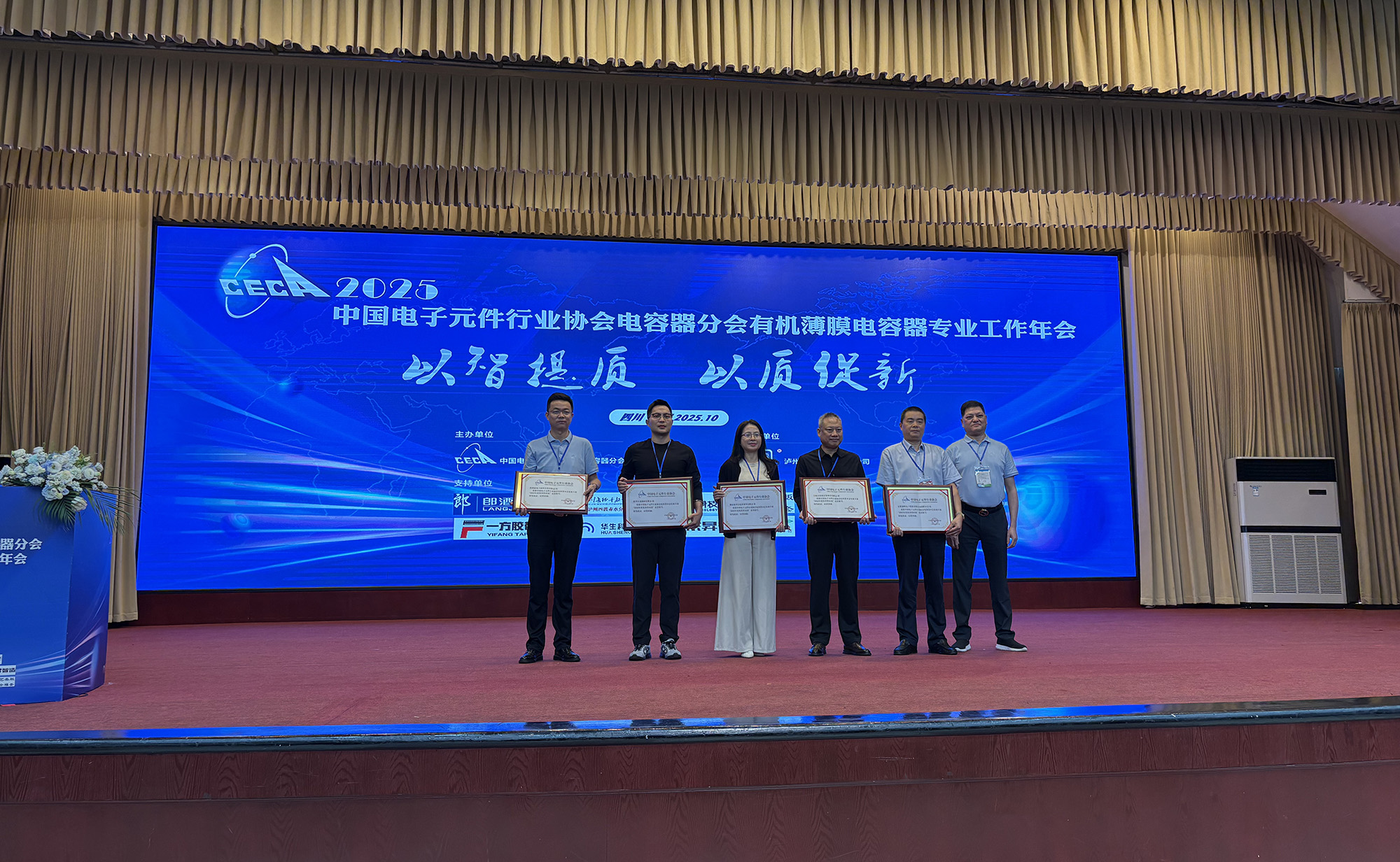 10月14日至17日,中國電子元件行業(yè)協(xié)會電容器分會有機專業(yè)2025年工作年會在四川瀘州成功舉辦。中電元協(xié)常務理事、電容器分會第九屆副理事長、公司總經(jīng)理鮑俊華代表公司出席并作主題交流報告。薄膜分公司獲評電容器分會2025年度“優(yōu)秀供應商”榮譽稱號。